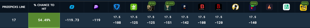 Oddsjam compares lines from 14 sites (seen above). Not all sites will have that exact prop up to compare to, however. Still, on PrizePicks we can see all the way on the left (seen above) the line is at 17 points, this time for Brandon Miller in the NBA, while all other sites have this at 17.5 and some, like Caesars, have it at -151 to go over 17.5 points. The combination of the slightly higher line at 17.5 plus some sites having it as high at -151 to go over that already higher line makes it a good value pick.