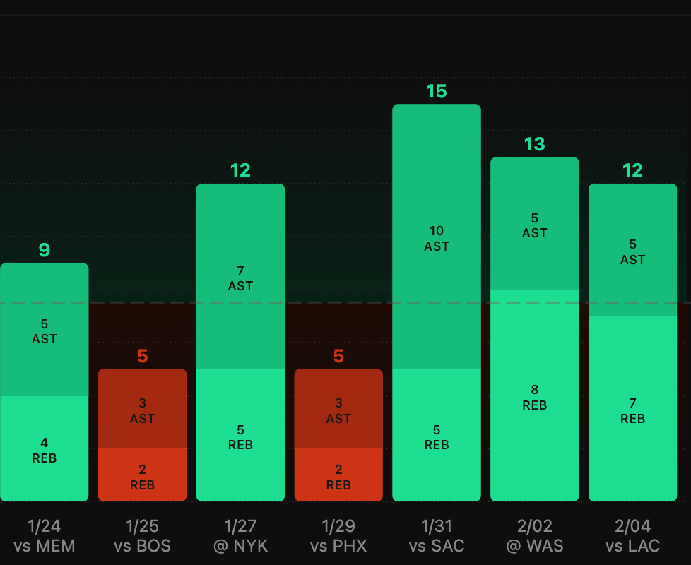 So far with the Heat he has continued to hit this. In 5 of 7 games with Miami he has gone over the total. This includes getting 15, 13 and 12 combined rebounds plus assists in his last 3 games.