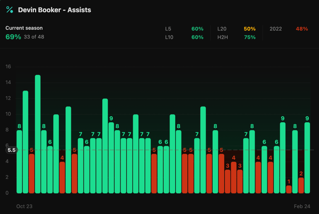 (Shown above on Outlier), we can see that Devin Booker has hit this in 69% of his games. Lines on Prizepicks don’t come around this often. There was even a stretch earlier in the season where Booker hit this in 12-straight games and also 16 of 17 games.