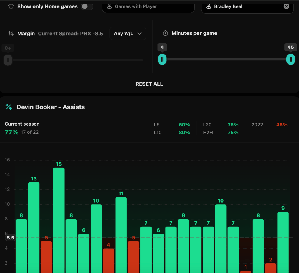 Also, Bradley Beal, who hasn’t played since February 13th, is a game time decision. In 17 of 22 games Booker has played this year without Beal he’s hit this. Pretty cool how easy that is to filter on Outlier.