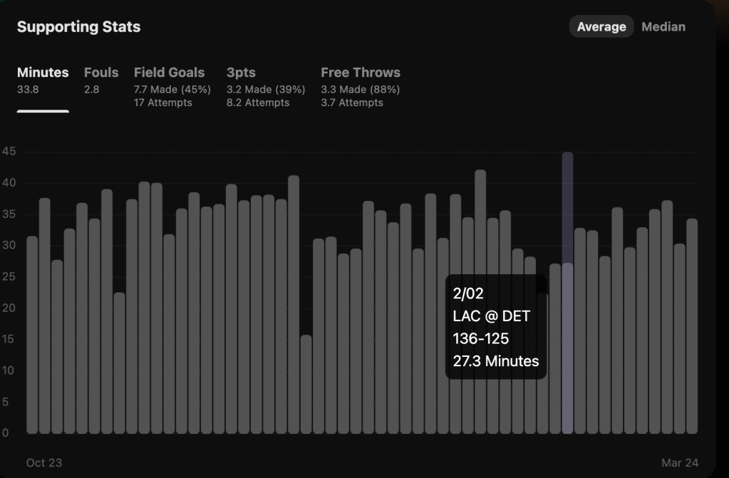 Looking above on Outlier we can also see George’s minutes chart. We notice again that in this rough stretch where he was coming back from an injury he played 28 or less minutes in 6 of 8 games. Recently his minutes have been up in close games. in 4 of his last 5 games the contests have been competitive and he played 33 minutes or more in those games.