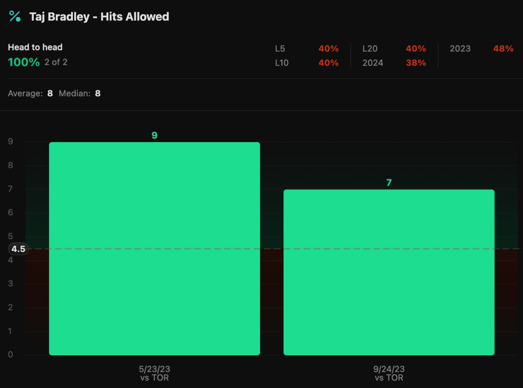 Looking above on Outlier we can also toggle to show H2H matchups. These date back to last season where he faced Toronto twice and allowed 9 and 7 hits.