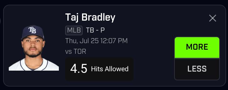 Taj Bradley has a tough matchup against Toronto. With the line on PrizePicks at 4.5 hits allowed, I’m liking the over. Let’s look more into this one below.
