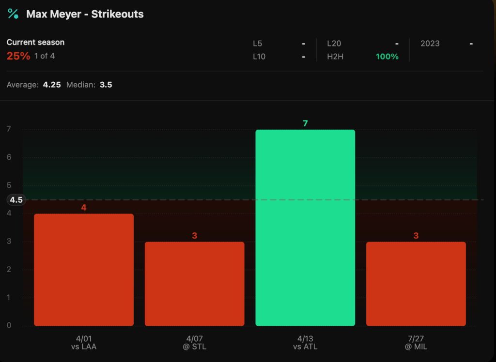 Here we can see Max Meyer has only hit this in 1/4 games this year. It’s a small sample size but we can also see that the one game where he went over he smashed it with 7. That game was also against the Atlanta Braves who Max Meyer is facing today.