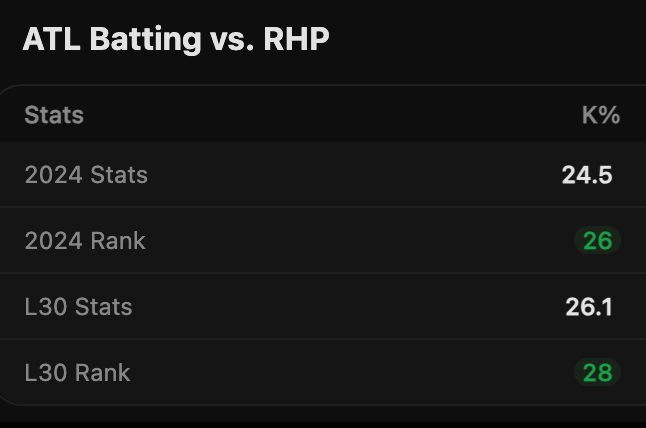 Also on Outlier we can see data about Max Meyer’s opponent, the Atlanta Braves, for the line we are looking at. Here we see that Atlanta is 26th in strikeouts per game and 28th the last 30 days, trending towards an even higher K rate.