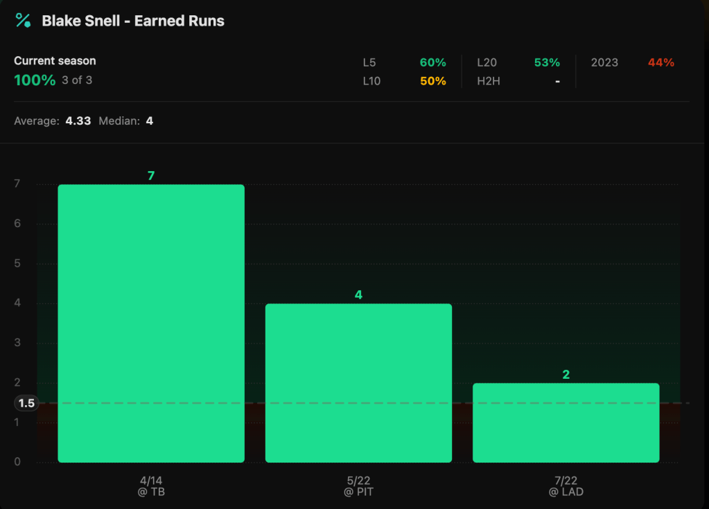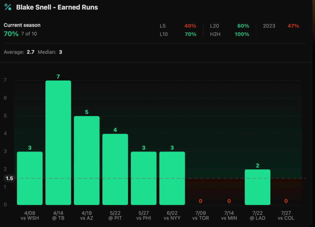 Blake Snell has been brutal this year overall He’s 0-3 in 10 starts with a 5.1 ERA. His July was better but can we trust him? With the line on PrizePicks at 1.5 Earned Runs, I’m liking the over. Let’s look more into this one below.